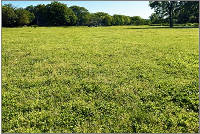 実際、自分の足元の芝は、タテに生えているので、土の「黒さ」が色濃く見えます。